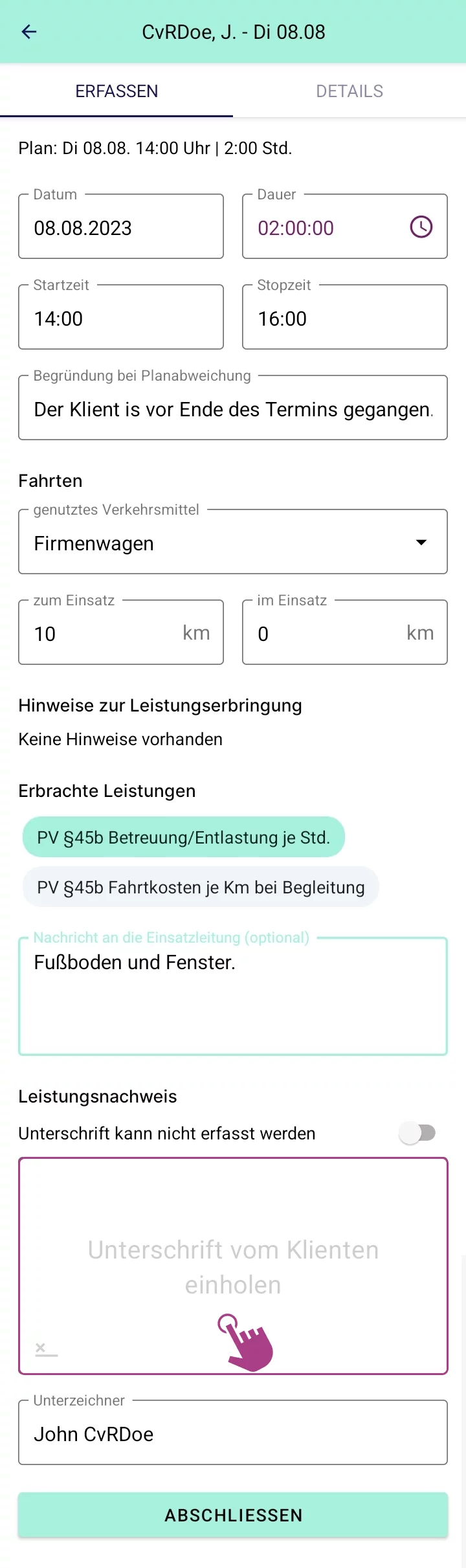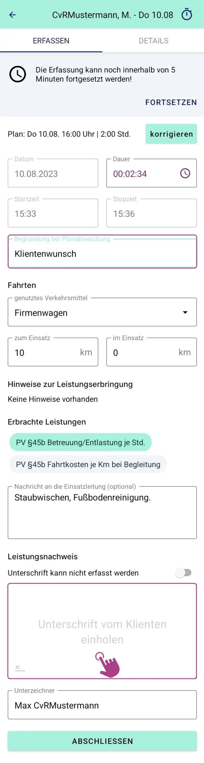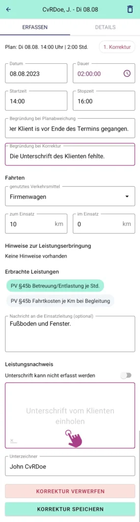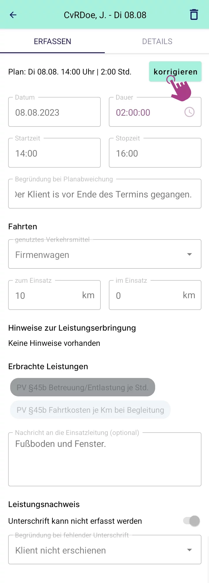 Nacherfassung eines Besuchs mit der Stempeluhr: